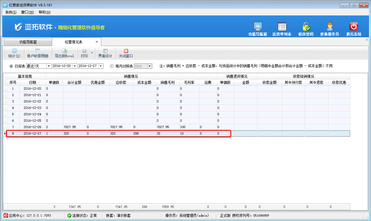 選擇日報表匯總,錄入查詢時間,點擊工具欄中的“匯總”按鈕即可顯示該日期范圍內(nèi)的銷售情況、退貨情況及收款結銷情況。