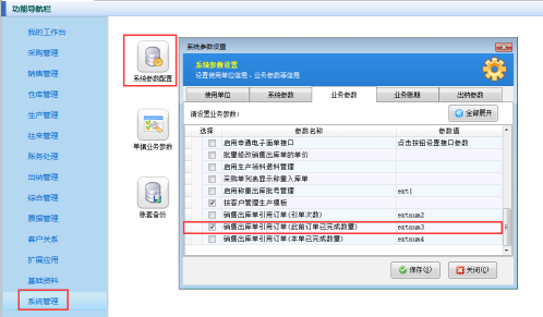 在功能導(dǎo)航窗點擊“系統(tǒng)管理”——》“系統(tǒng)參數(shù)設(shè)置”——》“業(yè)務(wù)參數(shù)”可以進(jìn)入到“業(yè)務(wù)參數(shù)”配置界面,在特殊功能參數(shù)內(nèi)打勾啟用“銷售出庫單引用訂單(此前訂單已完成數(shù)量)”參數(shù),并設(shè)置參數(shù)值(擴(kuò)展數(shù)值字段名),默認(rèn)為“extnum3(擴(kuò)展數(shù)值3)”,如下圖一所示。