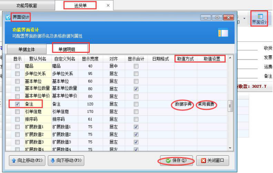 以送貨單軟件為例,示范下如何設(shè)置備注為選擇項,首先打開一個送貨單,打開工具欄中的“界面設(shè)計”選擇“單據(jù)明細”中的備注項。取值方式選擇“數(shù)據(jù)字典”,取值設(shè)置選擇“常用摘要”,然后保存設(shè)置,如下圖所示: