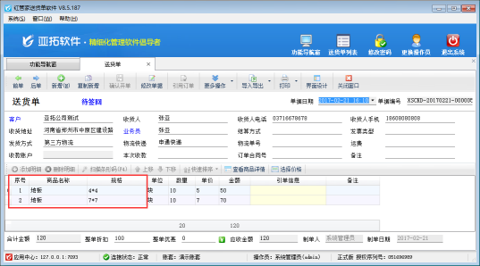設(shè)置完成之后,我們在功能導(dǎo)航窗點(diǎn)擊“業(yè)務(wù)處理”—》“新開送貨單”,新增送貨單時直接錄入“新商品名稱+規(guī)格”并確認(rèn)開單,如下圖二中所示,兩條單據(jù)明細(xì)分別錄入不同規(guī)格的新商品“地板”。
