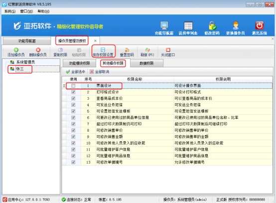 亞拓管理軟件紅管家倉庫管理軟件紅管家出納記賬軟件紅管家送貨單軟件內都可以設置多個操作員并對操作員賬號設置權限,部分用戶不希望員工賬號可以隨便修改軟件界面格式,如何設置呢?本篇文章以紅管家送貨單軟件為例詳細介紹一下送貨單軟件內如何設置操作員不可進行軟件界面設計?