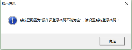 設置完成后,我們使用操作員賬號登陸軟件時,系統會提示“系統已配置為‘操作員登陸密碼不能為空’,請設置系統登陸密碼!”,如下圖二所示。