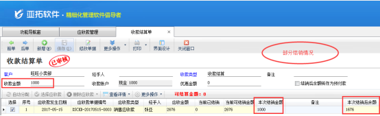 在“應(yīng)收款管理”中選擇應(yīng)收款,點(diǎn)擊“收款結(jié)算”進(jìn)入收款結(jié)算單界面,本次結(jié)銷(xiāo)部分金額和收款金額輸入一致,點(diǎn)擊“保存”則應(yīng)收款管理中狀態(tài)變?yōu)椤安糠纸Y(jié)銷(xiāo)”,下次付余款可以繼續(xù)選擇“部分結(jié)銷(xiāo)”的應(yīng)收款進(jìn)行結(jié)銷(xiāo)操作。如下圖3所示: