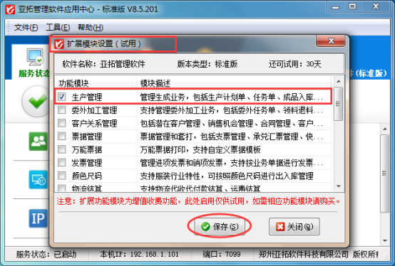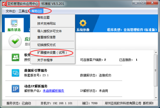 亞拓管理軟件(標準版、專業版)、紅管家倉庫管理軟件等都支持配置擴展模塊,軟件在購買之前支持先試用擴展模塊功能,我們以亞拓管理軟件標準版為例示范下如何在試用軟件時配置出擴展模塊進行試用。