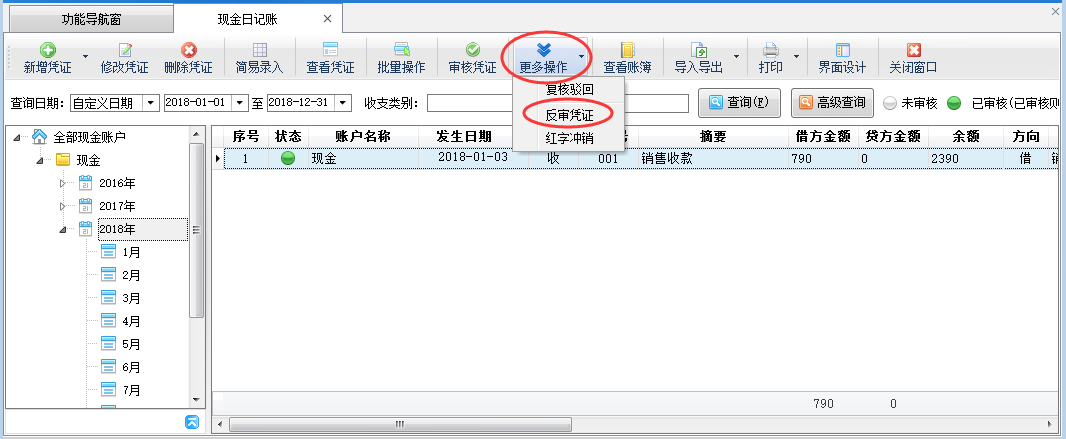 在功能導(dǎo)航窗點(diǎn)擊“現(xiàn)金日記賬”打開現(xiàn)金日記賬界面,選擇一個“已審核”的日記賬憑證,然后點(diǎn)擊“更多操作”—》“反審憑證”(如下圖二所示),系統(tǒng)會彈出提示信息“您確定要反審當(dāng)前憑證?”(如下圖三所示),點(diǎn)擊“確定”按鈕即可對“已審核”憑證進(jìn)行反審操作,反審后,憑證狀態(tài)變?yōu)椤拔磳徍恕保藭r可以對這個未審核的憑證進(jìn)行修改操作(如下圖四所示)。