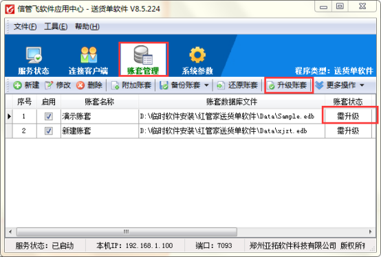 本文章以信管飛送貨單軟件為例,示范升級版本后賬套如何升級操作。軟件升級的版本可以直接在官網上下載最新版本,然后覆蓋安裝在原路徑中。安裝完成后,打開應用中心程序,可以在賬套管理中看到賬套狀態為“需升級”狀態。升級賬套有以下兩種方法。