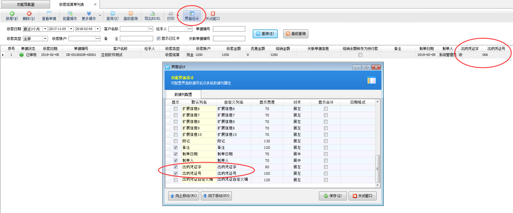 在功能導(dǎo)航窗點(diǎn)擊“往來管理”—》“收款結(jié)算單”即可打開收款結(jié)算單列表界面,然后通過工具欄內(nèi)“界面設(shè)計(jì)”功能可以將“出納憑證字”及“出納憑證號”數(shù)據(jù)項(xiàng)配置顯示出來,可以快速查看到收款結(jié)算單轉(zhuǎn)記的“出納憑證字”及“出納憑證號”,如下圖一所示。然后選中一個(gè)存在轉(zhuǎn)記出納憑證記錄的收款結(jié)算單,點(diǎn)擊工具欄中“更多操作”—》“查看相關(guān)出納憑證”按鈕(如圖二所示),即可快速打開相關(guān)出納憑證界面,查看相關(guān)出納憑證詳情(如下圖三所示)。