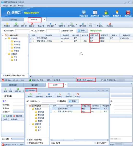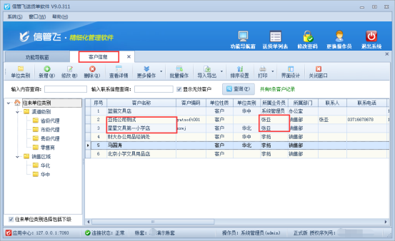 以“信管飛送貨單軟件”為例,示范下如何控制操作員僅能查看所屬為自己的客戶信息。首先需要在客戶信息中進行整理下客戶的所屬業(yè)務(wù)員信息,如下圖1所示,示例以員工“張亞”為例。