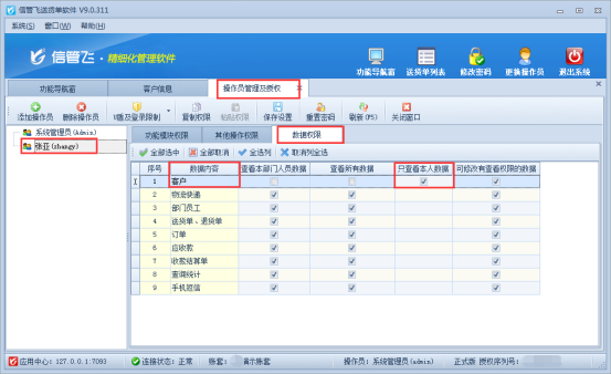 信管飛RMS軟件、信管飛倉庫管理軟件、信管飛送貨單軟件等都支持設(shè)置操作員權(quán)限,以控制操作員登錄軟件所顯示的功能,如公司需要限定操作員僅能查看和選擇自己所屬客戶信息,軟件中可以進行控制。