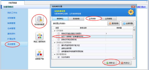 在功能導航窗點擊“系統管理”—》“系統參數配置”—》“業務參數”,即可進入到“業務參數”配置界面,在打印參數內找到“處于‘待審核’的單據可打印”參數,把這個參數的勾選去掉,然后保存,如下圖一所示。