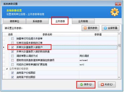 軟件中默認(rèn)是允許開單時直接錄入新客戶/供應(yīng)商的。如果該業(yè)務(wù)參數(shù)沒有被勾選,需要我們在使用此功能之前對相應(yīng)的業(yè)務(wù)參數(shù)進行設(shè)置。在“業(yè)務(wù)參數(shù)”界面上我們將“開單允許直接錄入新客戶”勾選上,然后進行保存。