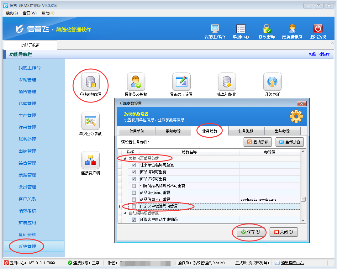 以信管飛RMS為例,在“系統(tǒng)管理”—》“系統(tǒng)參數(shù)配置”—》“業(yè)務(wù)參數(shù)”內(nèi)將“數(shù)據(jù)可否重復(fù)參數(shù)”中的“自定義單據(jù)編號(hào)可重復(fù)”參數(shù)的勾選取消,然后保存設(shè)置。如下圖1所示: