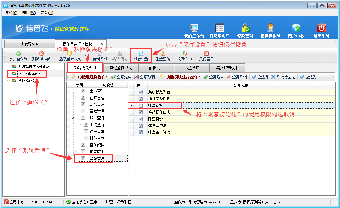 執(zhí)行賬套初始化操作后,會刪除賬套內(nèi)相應(yīng)的數(shù)據(jù),因此務(wù)必提前做好備份,謹(jǐn)慎操作!為了避免操作員誤操作,導(dǎo)致數(shù)據(jù)丟失,軟件內(nèi)支持設(shè)置操作員不可進(jìn)行賬套初始化操作,下面以信管飛出納記賬軟件專業(yè)版為例來演示一下具體的操作步驟。