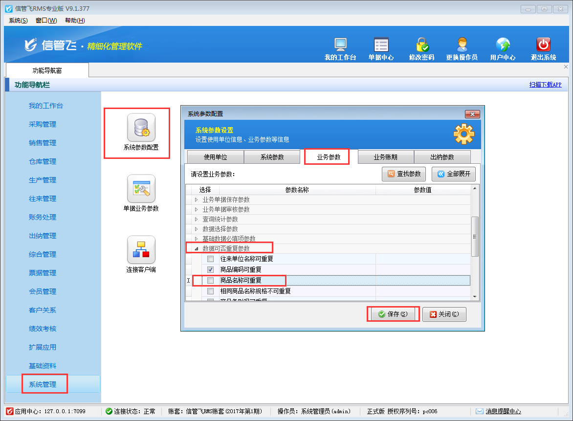 以信管飛RMS為例,在系統(tǒng)管理—》系統(tǒng)參數(shù)配置—》業(yè)務(wù)參數(shù)內(nèi)將“數(shù)據(jù)可否重復(fù)參數(shù)”中的“商品名稱(chēng)可重復(fù)”參數(shù)的勾選取消,然后保存設(shè)置。如下圖所示: