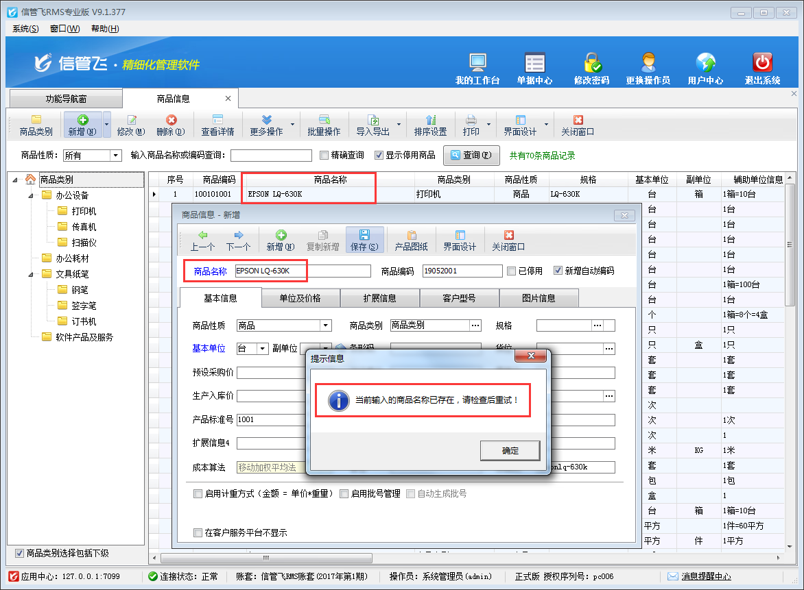 設(shè)置完成后,打開(kāi)功能導(dǎo)航窗的“基礎(chǔ)資料”—》“商品信息”,新增一個(gè)商品,輸入和之前已有商品一樣的名稱(chēng),保存時(shí)系統(tǒng)會(huì)提示“當(dāng)前輸入的商品名稱(chēng)已存在,請(qǐng)檢查后重試!”,如下圖所示: