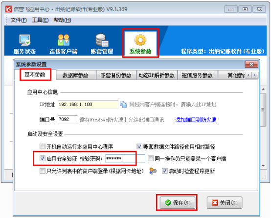 在應(yīng)用中心界面點(diǎn)擊“系統(tǒng)參數(shù)”,在“基本參數(shù)”界面打勾選擇“啟用安全驗(yàn)證”,并輸入校驗(yàn)密碼進(jìn)行保存(也可以在菜單中點(diǎn)擊“文件”——》“系統(tǒng)參數(shù)設(shè)置”進(jìn)入系統(tǒng)參數(shù)設(shè)置界面),下圖2為系統(tǒng)參數(shù)設(shè)置界面。