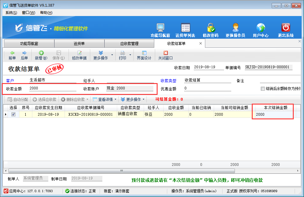 收款結(jié)算單用來登記收款信息(收款對(duì)象即客戶、收款賬戶、收款金額、經(jīng)手人等),并結(jié)銷應(yīng)收款記錄。本篇文章以送貨單打印軟件為例演示一下對(duì)應(yīng)收款進(jìn)行收款結(jié)算的操作步驟。