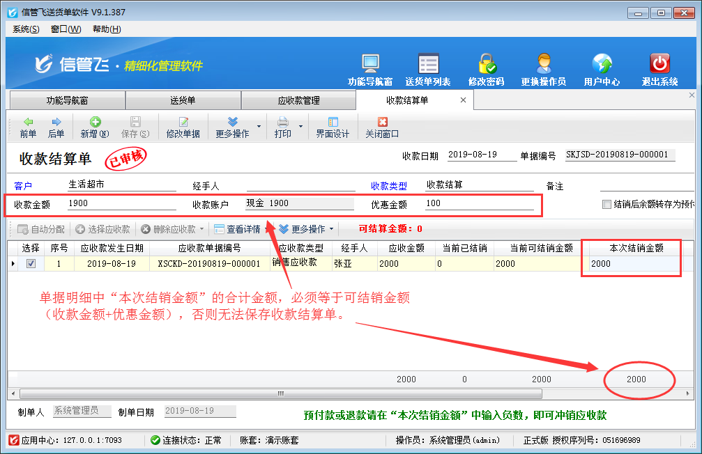 注意:收款結(jié)算單單據(jù)明細(xì)中“本次結(jié)銷金額”的合計(jì)金額,必須等于可結(jié)銷金額(收款金額 + 優(yōu)惠金額),否則無法保存收款結(jié)算單。