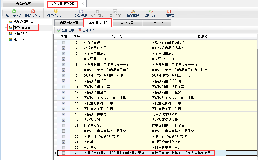 本文以信管飛送貨單軟件為例,在功能導航窗點擊“系統管理”—》“操作員及授權”進入操作員管理及授權界面,如下圖所示:選擇操作員“張亞”,在右側權限設置界面,選擇“其他操作權限”,把權限“可操作商品信息中的‘替換商品(業務單據)’功能”取消勾選,然后保存配置。
