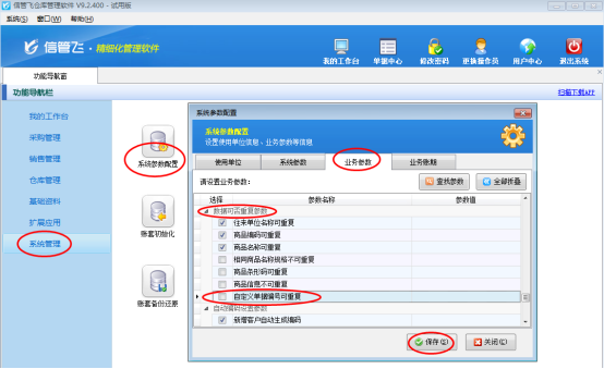 以信管飛倉庫管理軟件為例,在“系統管理”—》“系統參數配置”—》“業務參數”內將“數據可否重復參數”中的“自定義單據編號可重復”參數的勾選取消,然后保存設置。如下圖1所示: