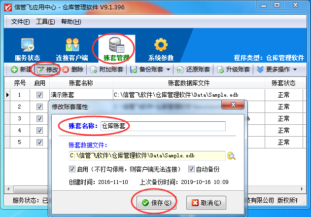 以“信管飛倉庫管理軟件”為例,示范下如何修改賬套的名稱。打開紅色的應用中心程序(應用中心運行后桌面右下角會顯示相應的圖標,點擊即可打開應用中心主界面),在賬套管理界面,點擊賬套后選擇工具欄中的“修改”按鈕,彈出“修改賬套屬性”界面,把“演示賬套”修改為“倉庫賬套”,然后點擊“保存”按鈕,如下圖所示: