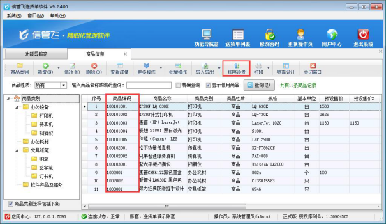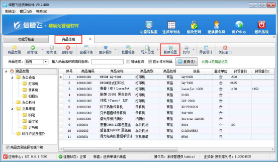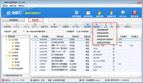 信管飛送貨單軟件、信管飛倉(cāng)庫(kù)管理軟件、信管飛RMS軟件開單時(shí)都可以直接從商品信息中選擇已有的商品進(jìn)行快速開單,軟件都支持對(duì)商品信息進(jìn)行排序。開單添加明細(xì)時(shí)彈出的“選擇商品”窗口中商品信息顯示的先后順序如果需要調(diào)整,可以到商品信息中調(diào)整。下面我們以信管飛送貨單軟件為例介紹一下對(duì)商品信息排序的操作方法。