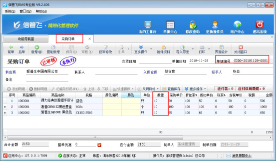 設置完之后,在功能導航窗點擊“采購管理”—》“采購訂單”,新增采購訂單,添加三條商品明細,數量分別為10,然后保存并審核采購訂單,如下圖所示。