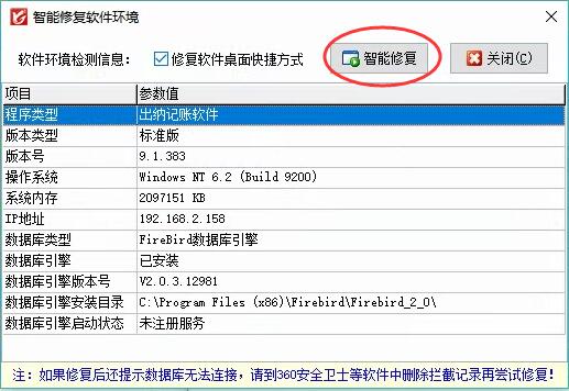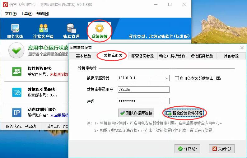 在軟件應(yīng)用中心程序中,點(diǎn)擊“系統(tǒng)參數(shù)”->“數(shù)據(jù)庫參數(shù)”打開數(shù)據(jù)庫參數(shù)配置界面,然后點(diǎn)擊“智能修復(fù)軟件環(huán)境”按鈕打開智能修復(fù)軟件環(huán)境界面智能修復(fù)軟件環(huán)境即可,如下圖所示(或者在軟件應(yīng)用中心程序中點(diǎn)菜單“工具”->“智能修復(fù)軟件環(huán)境”同樣可以打開智能修復(fù)軟件環(huán)境界面智能修復(fù)軟件環(huán)境)。