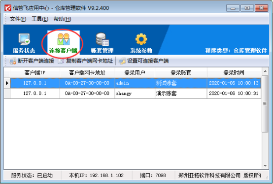 第一種方法:在信管飛倉庫管理軟件應用中心程序中查看已登錄軟件的連接客戶端。