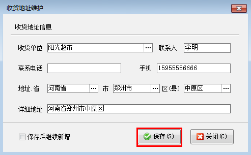 如圖2所示,點擊“添加地址”按鈕,系統彈出“收貨地址維護”窗口,選擇一下收貨單位(收貨單位也支持直接錄入,收貨單位名稱可以和客戶名稱不一致),然后錄入一下地址信息,如圖3所示,錄入信息后保存。保存后可以在收貨地址界面看到剛才新增的地址記錄,如圖4所示。