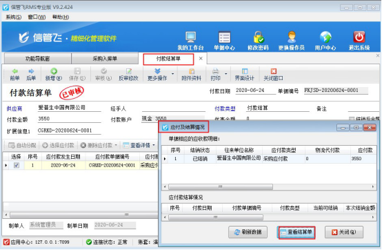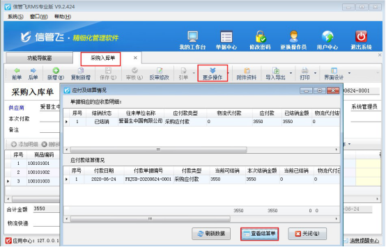 本篇文章以信管飛RMS為例,示范下如何修改應(yīng)付款已結(jié)銷(xiāo)的采購(gòu)入庫(kù)單單據(jù),打開(kāi)應(yīng)付款已結(jié)銷(xiāo)的采購(gòu)入庫(kù)單單據(jù),在更多操作下點(diǎn)擊“查看應(yīng)付款及結(jié)銷(xiāo)情況”,彈出應(yīng)付款及結(jié)銷(xiāo)情況界面,點(diǎn)擊“查看結(jié)算單”可以打開(kāi)本單據(jù)的應(yīng)付款結(jié)算單界面,如下圖所示:
