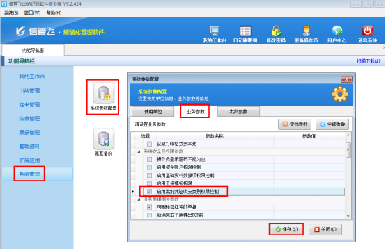 在功能導航窗選擇“系統管理”—》“系統參數配置”—》“業務參數”進入業務參數配置界面,在系統安全及權限參數中勾選“啟用出納憑證收支類別權限控制”參數,如下圖1所示: