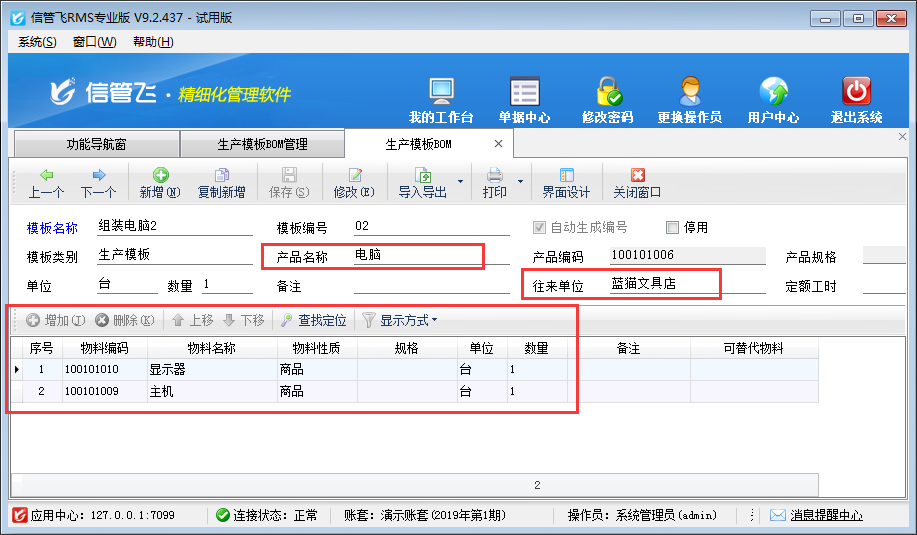參數(shù)配置完成之后,打開生產(chǎn)管理模塊,重新新增生產(chǎn)模板BOM表時,即可選擇往來單位,如下圖所示,在給“亞拓公司測試”、“藍貓文具店”兩家客戶生產(chǎn)同樣的產(chǎn)品“電腦”時設置的不同的生產(chǎn)模板,所需的原材料不同。