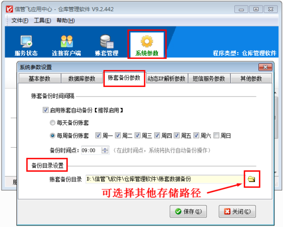 本文以信管飛倉庫管理軟件為例,介紹下如何修改賬套備份存儲目錄,打開應用中心程序(紅色圖標),點擊“系統參數”進入參數設置界面,選擇“賬套備份參數”,在賬套備份目錄設置中,可以修改默認目錄,如下圖1所示: