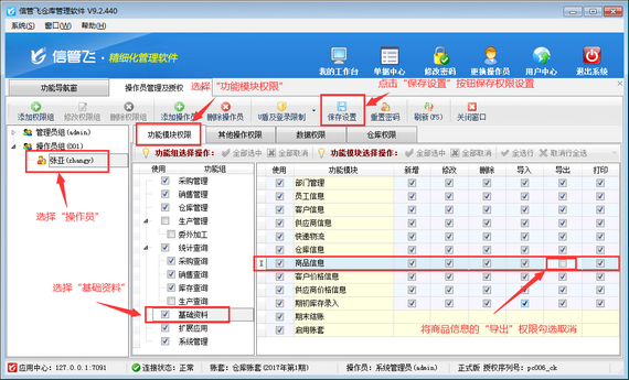 在功能導(dǎo)航窗點(diǎn)擊“系統(tǒng)管理”—》“操作員及授權(quán)”打開操作員管理及授權(quán)界面,選擇操作員“張亞”,在功能模塊權(quán)限界面,選擇“基礎(chǔ)資料”—》“商品信息”,在導(dǎo)出權(quán)限下,把商品信息“導(dǎo)出”權(quán)限勾選取消后保存權(quán)限設(shè)置,如下圖所示: