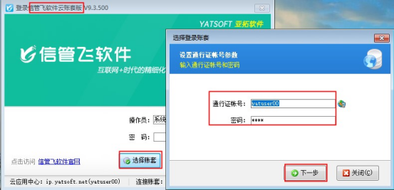 電腦只需要安裝云賬套版本程序(藍色圖標),登錄軟件點擊“選擇賬套”按鈕,彈出輸入界面,輸入通行證賬號和密碼,如下圖所示: