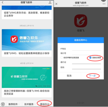 微信端登錄,手機微信關注公眾號“信管飛軟件”。關注后在公眾號界面右下方選擇“移動辦公”,彈出軟件登錄軟件,點擊“選擇賬套”,勾選“連接云賬套”輸入通行證賬號和密碼,下一步選擇賬套登錄軟件,如下圖所示: