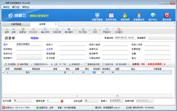 部分用戶在剛開始試用軟件時,開單添加一個商品后,不清楚如何在單據明細內繼續增加新的商品信息,如下圖所示,此問題在鍵盤上面按方向下鍵即可在單據明細中增加一行新行,另外軟件也支持設置在單據明細中添加商品后自動增加新行,本文以送貨單軟件為例演示一下具體設置方法。