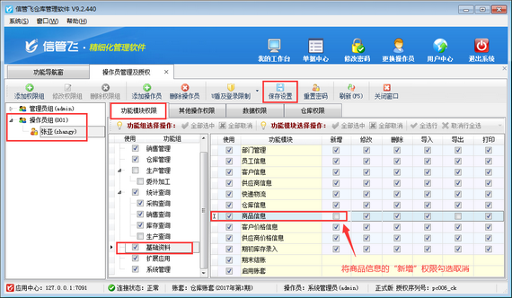 以信管飛倉庫管理軟件為例,示范下如何設(shè)置操作員不能新增商品信息。
