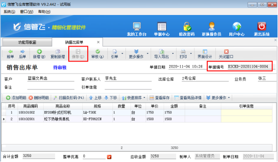 在功能導航窗點擊“銷售管理”—》“銷售出庫單”,開單并保存單據(jù),單據(jù)會直接自動生成一個單據(jù)編號,如下圖1所示: