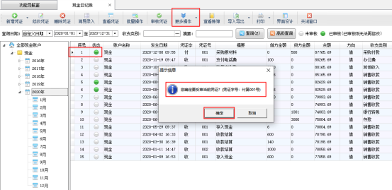 在現金日記賬列表界面,如圖2所示,點擊“更多操作”—》“反審憑證”,系統彈出提示信息“您確定要反審當前憑證?”,點擊“確定”按鈕,如圖3所示。