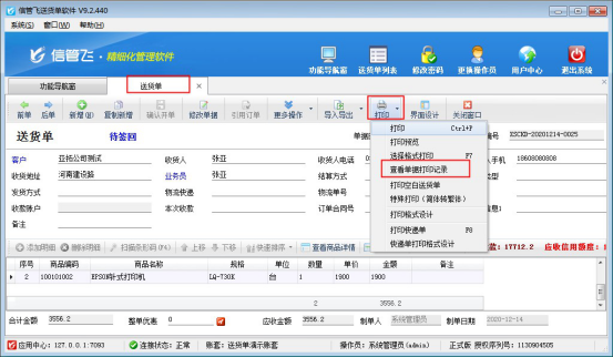 信管飛送貨單軟件信管飛RMS軟件等支持自定義打印模板,可選擇不同模板打印單據,可根據參數設置控制打印次數,跟蹤記錄單據每次打印情況,本文示范下如何查看單據打印記錄?