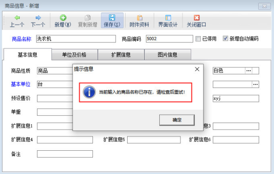 設置完成后,打開功能導航窗的“基礎資料”—》“商品信息”,新增一個商品,輸入和之前已有商品一樣的名稱,就可以保存成功了。如下圖所示: