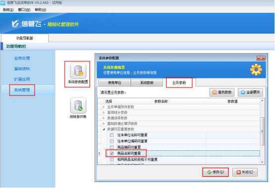 客戶遇到以上情況可通過設置商品名稱可重復進行解決。以信管飛送貨單軟件為例,在系統管理—》系統參數配置—》業務參數內將“數據可否重復參數”中的“商品名稱可重復”參數的勾選,然后保存設置。如下圖所示: