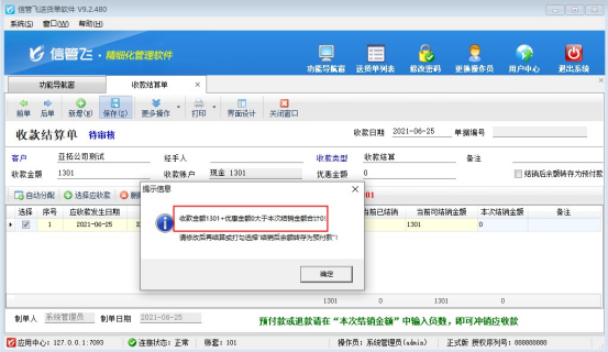 一、保存時(shí)提示“收款金額+優(yōu)惠金額大于本次結(jié)銷金額合計(jì)”,無法保存。如下圖所示:
