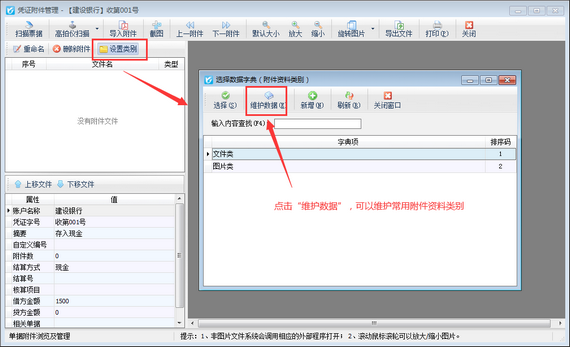 參數啟用后,回到銀行日記賬列表界面,新增憑證,打開憑證附件資料管理界面,即可看到在憑證附件管理界面已增加“設置類別”按鈕,點擊可以設置常用附件資料類別,如下圖所示。