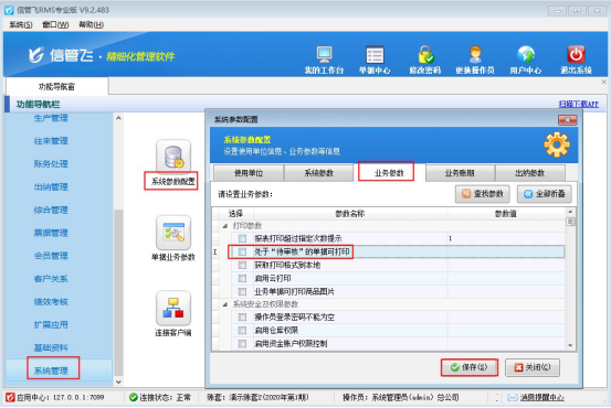 軟件默認允許“未審核”狀態的允許打印,在功能導航窗點擊“系統管理”—》“系統參數設置”,選擇業務參數,把參數“處于“待審核”的單據可打印”取消勾選,然后保存配置,如下圖所示: