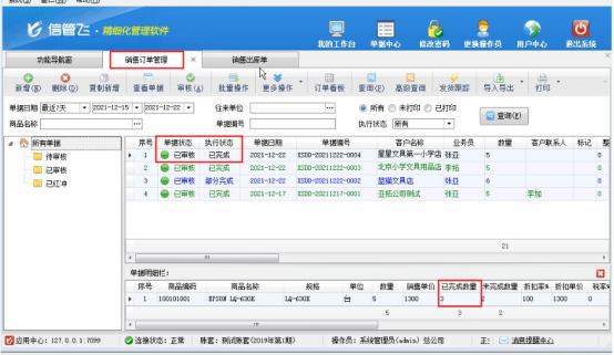 信管飛RMS軟件信管飛送貨單軟件等都支持先開訂單,出庫單可引用訂單開單,出庫單審核完成引用的訂單執行狀態會自動更新,執行狀態更新情況:出庫數量<訂單數量,訂單執行狀態變為部分完成,出庫數量=訂單數量,訂單執行狀態變為已完成。