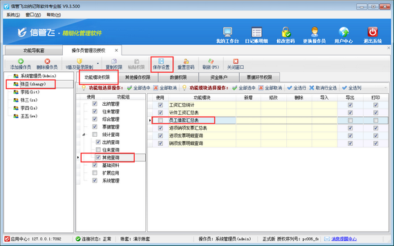 登錄軟件,在功能導(dǎo)航窗點擊“系統(tǒng)管理”—》“操作員及授權(quán)”,進入“操作員管理及授權(quán)”界面,選擇操作員“張亞”,在其右側(cè)的功能模塊權(quán)限內(nèi)選擇“其他查詢”模塊,將員工借款匯總表的“使用”權(quán)限勾選取消,然后保存設(shè)置,如下圖所示。
