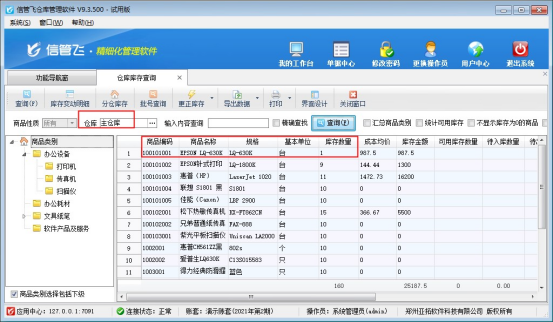 本文以“信管飛倉庫管理軟件”為例,示范下如何開“盤點單”,在功能導航窗點擊“倉庫管理”—>“倉庫庫存查詢”,可查看商品的當前庫存數量,以示例商品“EPSON LQ-630K”的庫存數量為例,當前查詢到庫存數數量為1。存在多倉庫情況的,需要先選擇倉庫然后再進行查詢,是獲取查詢的倉庫中的庫存數量,如下圖所示: